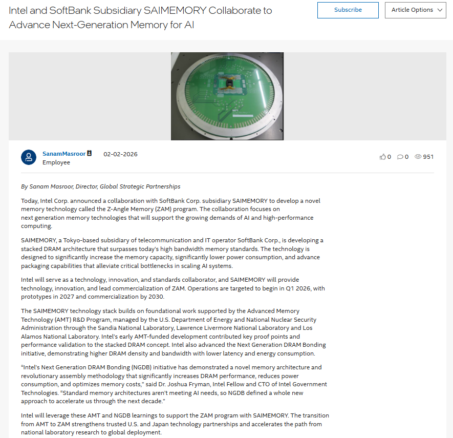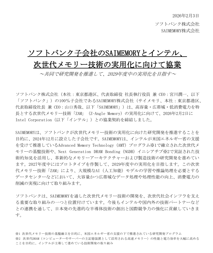 2026年2月3日;SAIMEMORY、Intelとの協業を正式発表