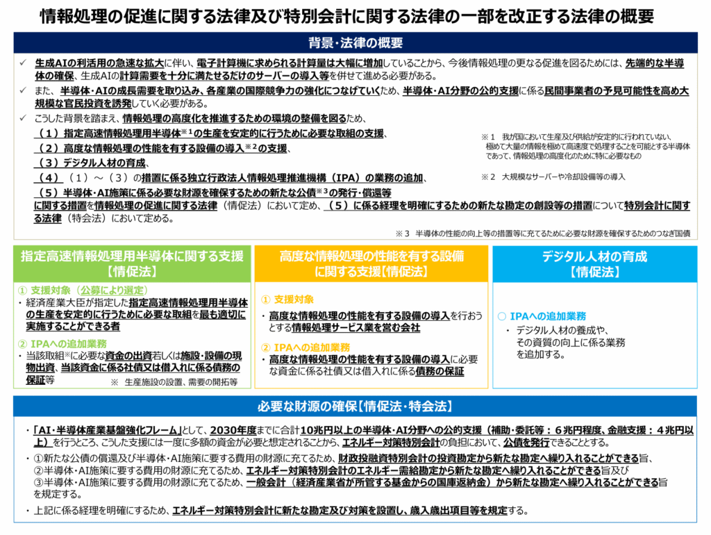 生成AIの利活用の急速な拡大に伴う計算需要の大幅な増加に対応するため、それに関連するハードウェア・ソフトウェアに関する支援、必要な財源を確保し、大規模な官民投資を誘発することが目的。