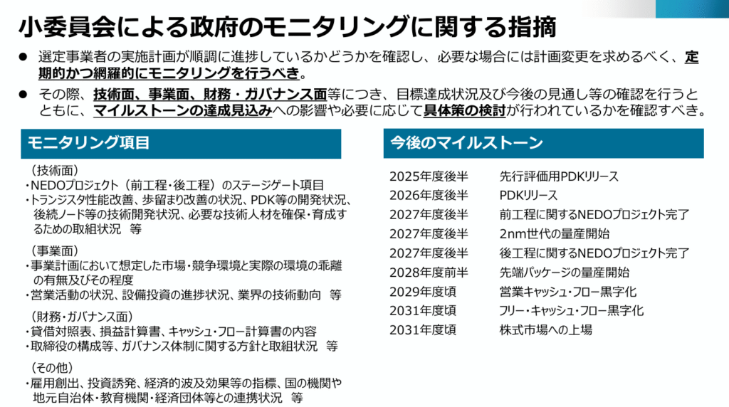 Rapidusに対する政府によるモニタリング項目と今後のマイルストーン