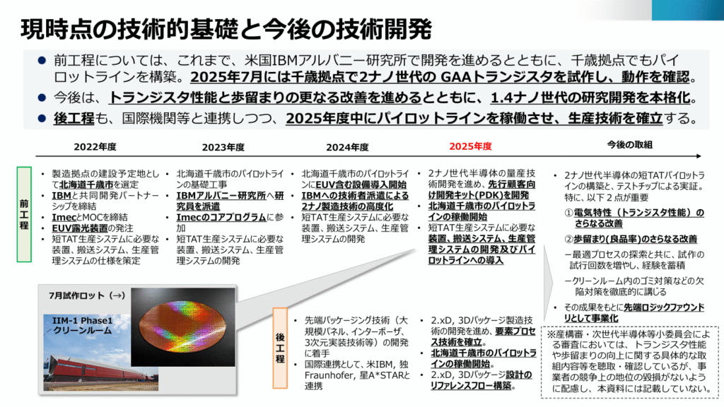 トランジスタ性能改善、歩留まり改善の状況、PDK等の開発状況、 後続ノード等の技術開発状況、必要な技術人材を確保・育成す るための取組状況 等