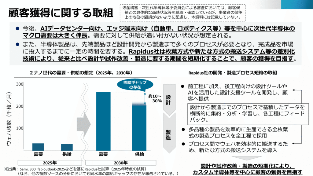 Rapidus社は枚葉方式や新たな方式の搬送システム*等の差別化技術により、従来と比べ設計や試作改善・製造に要する期間を短期化することで、顧客の獲得を目指す。